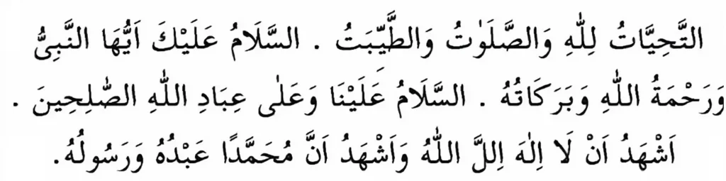 التَّحِيَّاتُ لِلَّهِ وَالصَّلَوَاتُ وَالطَّيِّبَاتُ السَّلاَمُ عَلَيْكَ أَيُّهَا النَّبِيُّ وَرَحْمَةُ اللَّهِ وَبَرَكَاتُهُ السَّلاَمُ عَلَيْنَا وَعَلَى عِبَادِ اللَّهِ الصَّالِحِينَ أَشْهَدُ أَنْ لاَ إِلَهَ إِلاَّ اللَّهُ وَأَشْهَدُ أَنَّ مُحَمَّدًا عَبْدُهُ وَرَسُولُهُ